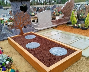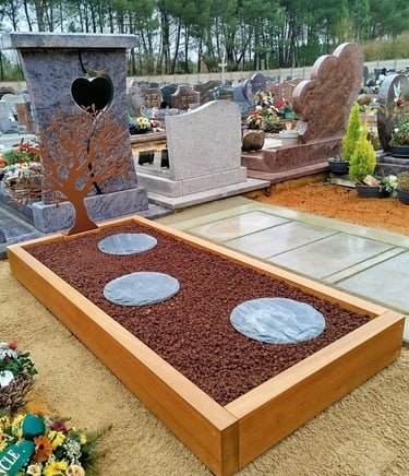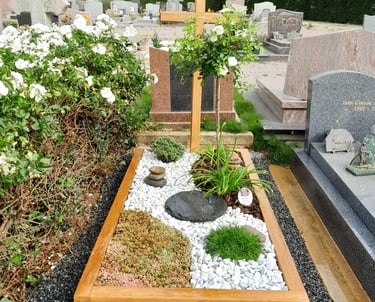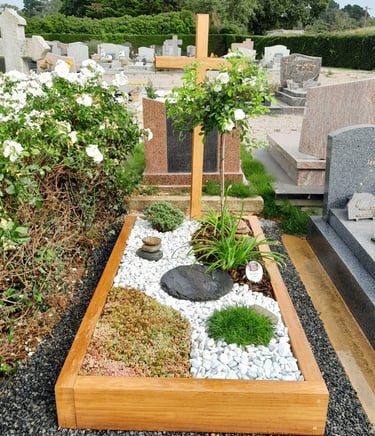 Nos encadrements simples (un seul étage de bois) créent un liseré naturel qui se fond harmonieusement dans l'environnement du cimetière. C’est le choix idéal pour une végétalisation basse, composée de mousses, de sedums ou de fleurs annuelles, offrant un hommage empreint de légèreté et de sérénité.