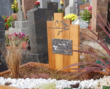 En travaillant des matériaux bruts et nobles tels que l'ardoise, le bois et le corten, je cherche à créer une harmonie visuelle entre la sépulture et son environnement naturel. Mon approche privilégie la douceur et la durabilité, pour offrir un lieu de recueillement apaisant et singulier.